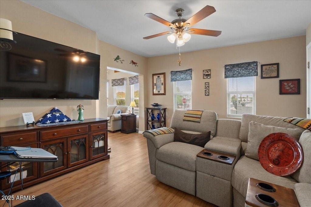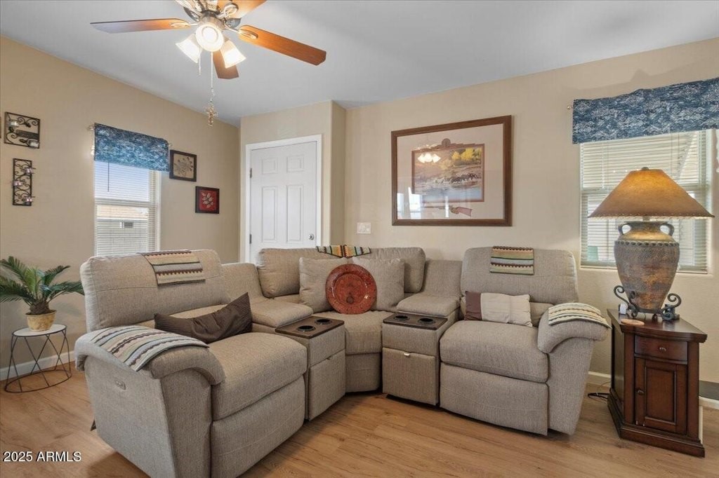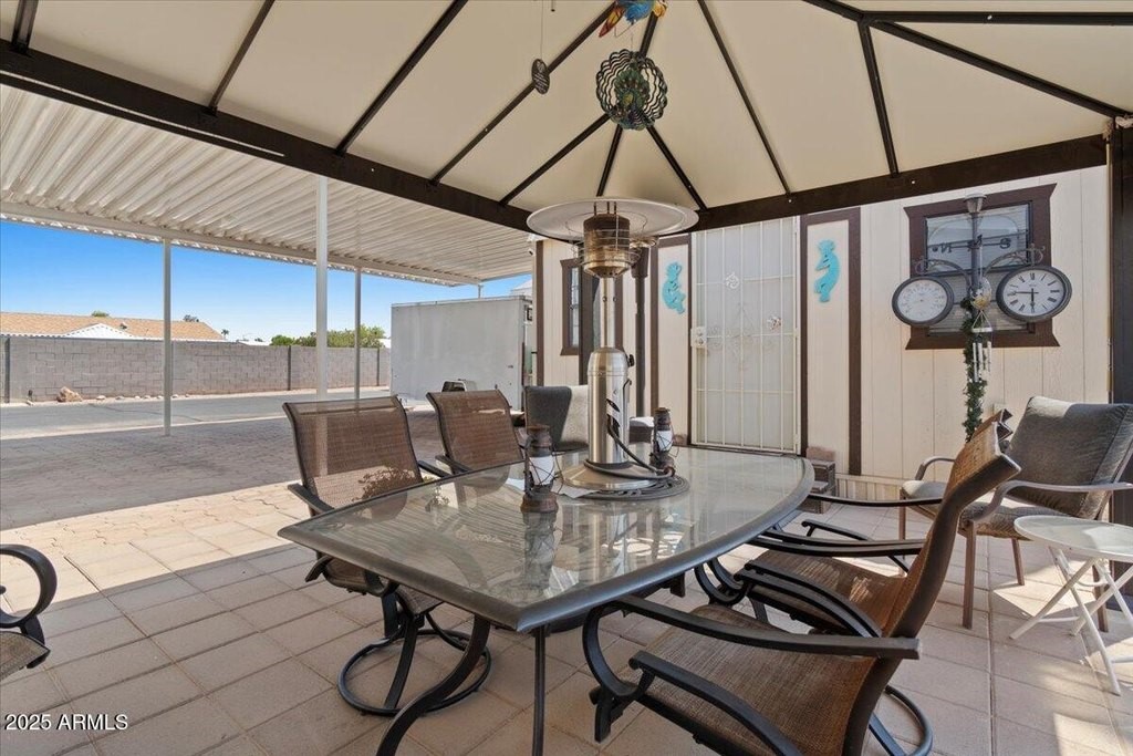 Discover this fully affixed 2 bed, 2 bath home in a vibrant 55+ community in Florence, AZ. Yes, you own the land! Corian counters throughout, tile backsplash & laminate wood floors. Sitting on 2 lots, this property offers exceptional space and versatility. Enjoy two 12x16 storage buildings on concrete foundations, each with its own a/c, perfect for hobbies, workshops, or extra storage. A huge covered parking area fits up to 3 vehicles, plus a charming gazebo for relaxing outdoors. The community features a sparkling pool, clubhouse, and endless activities, along with access to a golf course. Whether you're looking for a seasonal escape or a year-round haven, this combines comfort, convenience, and those unforgettable Arizona sunsets. Furniture available on separate bill of sale